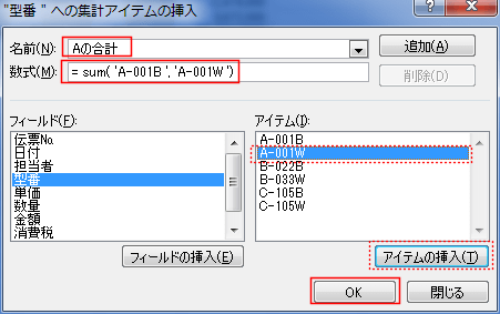 具体的には A-001BとA-001W を合計した集計フィールドを作成してみます。