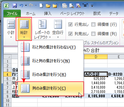 - なお、上図では行の集計が2重に計算されたため、[総計]→[列のみ集計を行う]としています。