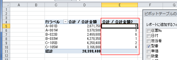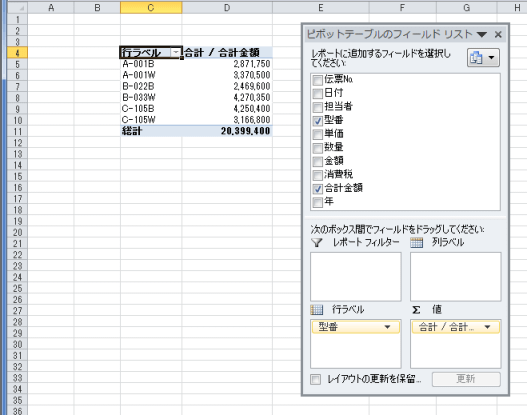 - ピボットテーブルで型番ごとに合計金額を集計しています。
