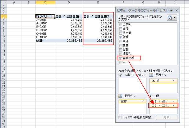 - 上記の1と同様に、合計金額を値フィールドに配置します。