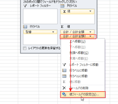 - フィールドリストの2つ目の「合計/合計金額2」をクリックして、「値フィールドの設定」を選択します。