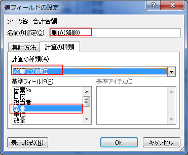 計算の種類で「降順での順位」を選択します。