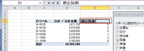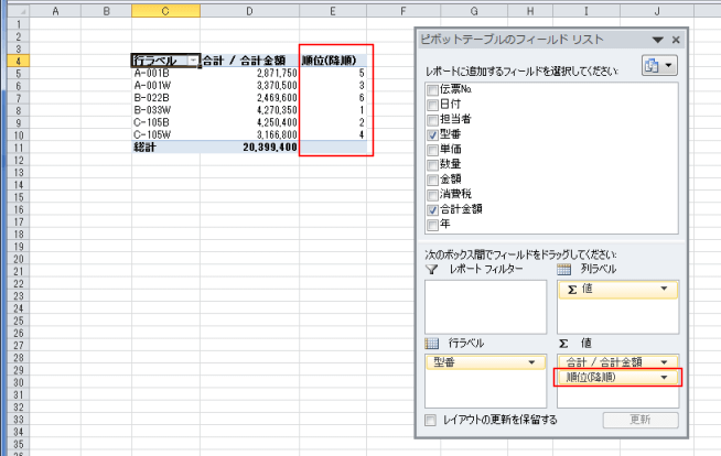 ピボットテーブルで順位を求める