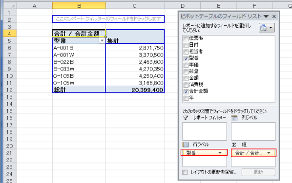 各型番の売上金額がピボットテーブルで集計されています。されています。