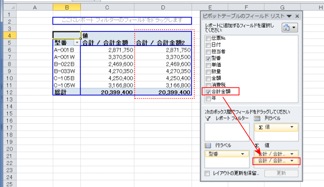 - フィールド「合計金額」をΣ値にドッラグして追加します。