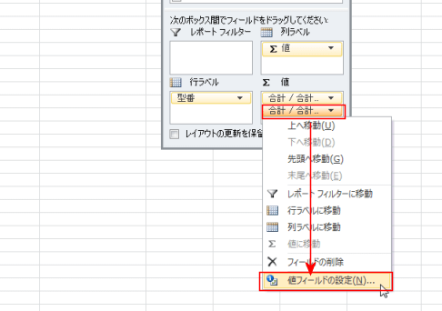 - フィールドリストの2つ目の「合計/合計金額」をクリックして、「値フィールドの設定」を選択します。