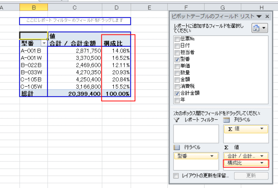 よねさんのExcelとWordの使い方|エクセル2010基本講座:目次|ピボットテーブルとピボットグラフ|ピボットテーブルで構成比を求める