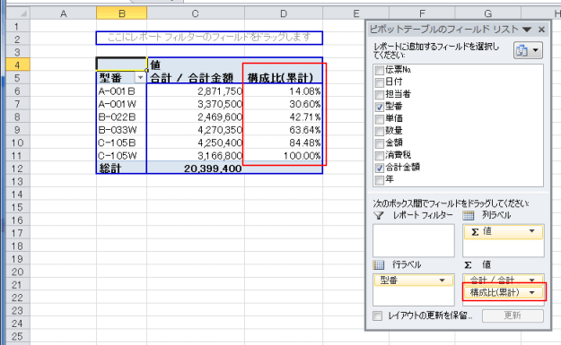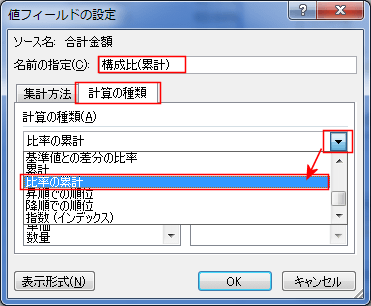 - 構成比の累計の同様に求めることができます。(途中までの操作は上記と同じなので省略します)