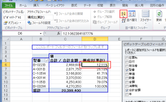 ピボットテーブルツールの[オプション]タブにある[昇順]ボタンをクリックすると、構成比の少ない順に並べ替えることができます。
