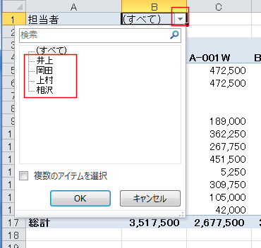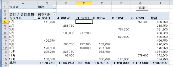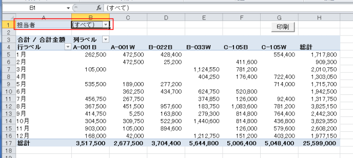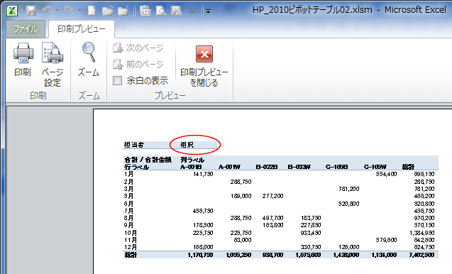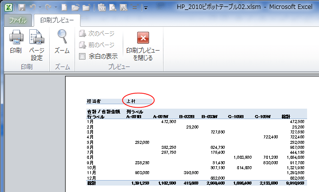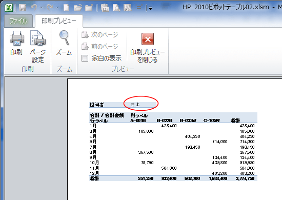 | Sub Test1() Dim PV As PivotTable, PvtItem As PivotItem Set PV = Worksheets("Sheet3").Range("A1").PivotTable For Each PvtItem In PV.PivotFields("担当者 ").PivotItems PV.PivotFields("担当者 ").CurrentPage = PvtItem.Name ActiveSheet.PrintPreview '印刷プレビュー ' ActiveSheet.PrintOut '印刷 Next End Sub |