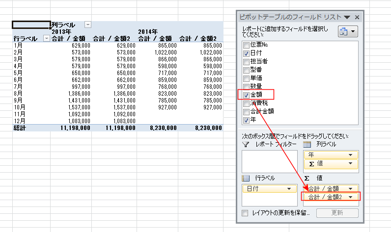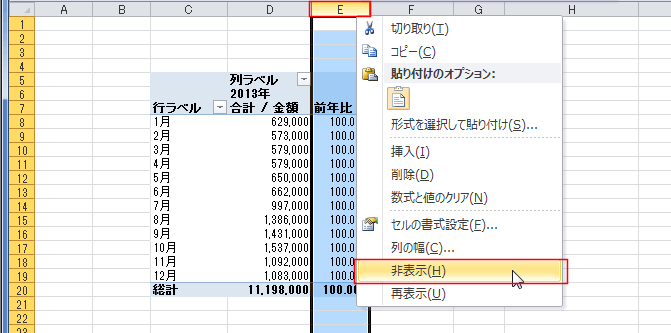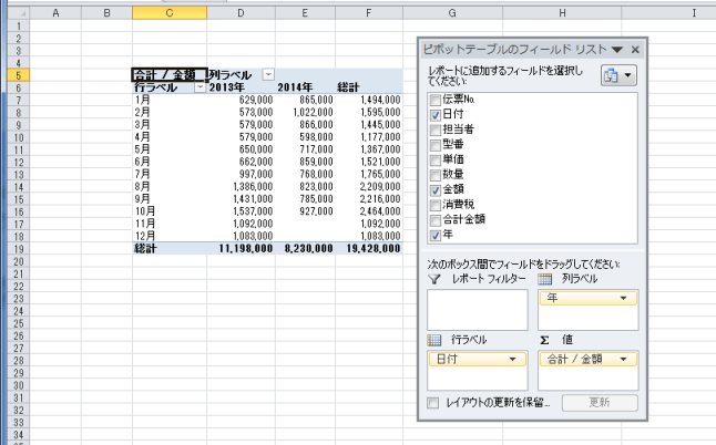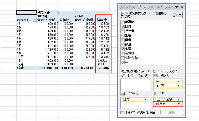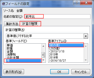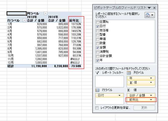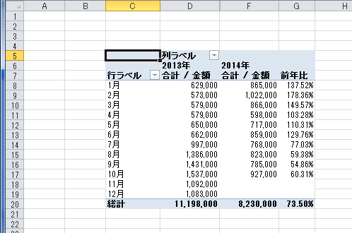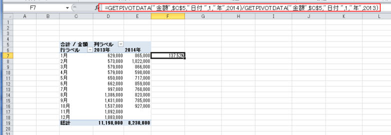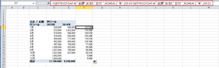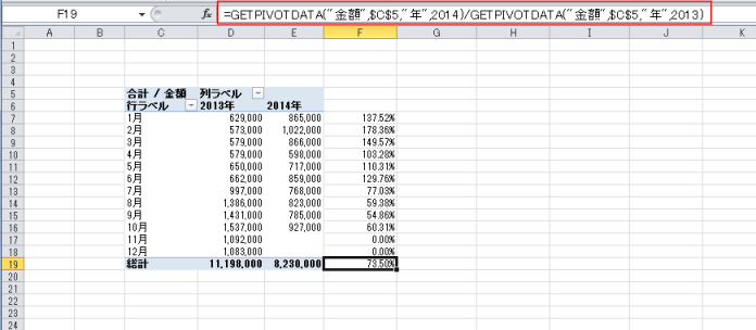 | 前年比を求める | GETPIVOTDATA関数を使って前年比を求める |