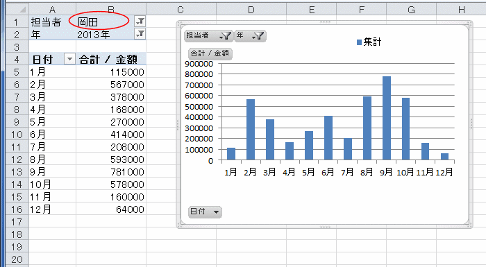 レポートフィルターで選択を変更すると、ピボットテーブルも変更されます。