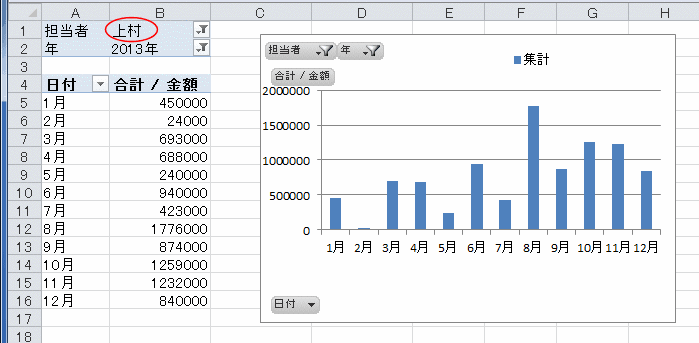 - ピボットテーブルのレポートフィルターで「上村」を選択します。