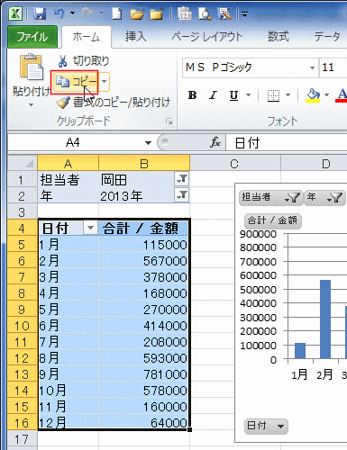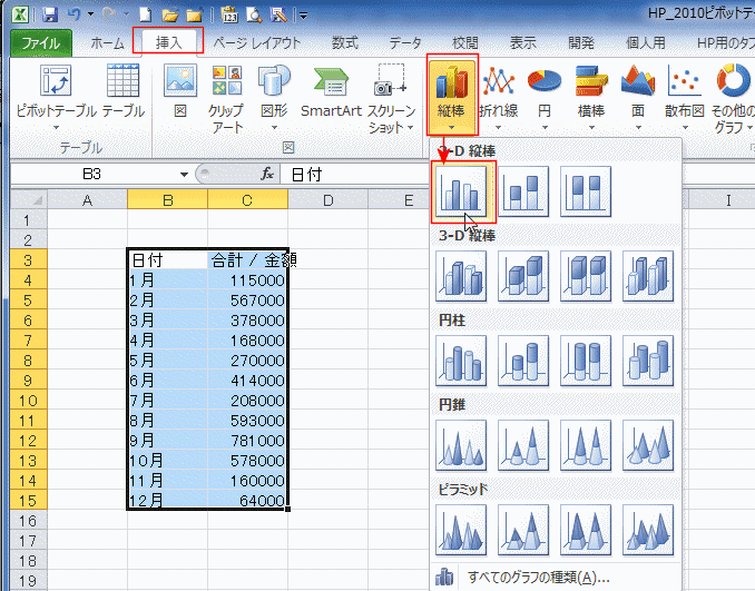 よねさんのExcelとWordの使い方|エクセル2010基本講座:目次|ピボットテーブルとピボットグラフ|ピボットテーブルから標準のグラフを作成したい