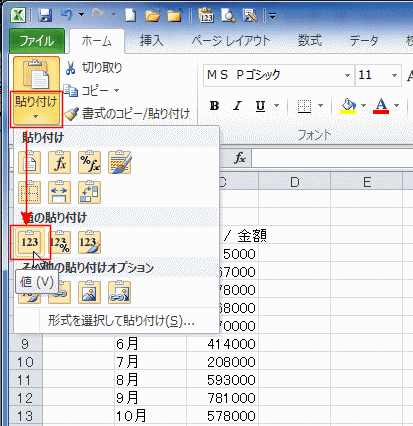 [ホーム]タブの[貼り付け]→[値]を選択します。