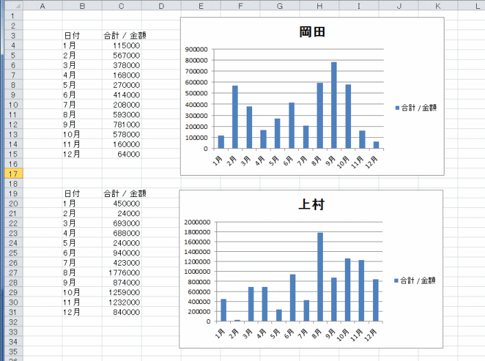 上記と同様に、ピボットテーブルのデータ範囲を選択して、コピー、値の貼り付けを実行し、標準のグラフを作成します。