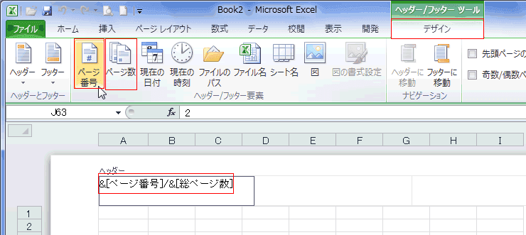 (下図は[ページ番号]をクリックした後、「/」をキーボードから入力し、[ページ数]をクリックして入力した状態です。)