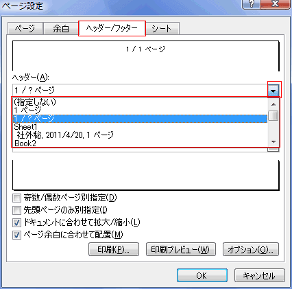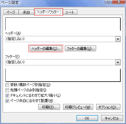 [ページ設定]ダイアログの[ヘッダー/フッター]タブを選択します。