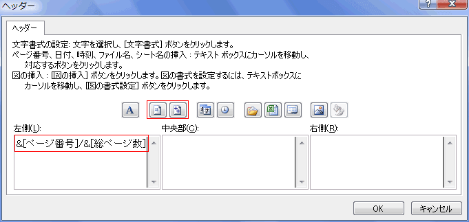 下図は左側を選択し、[ページ番号の挿入]ボタンをクリック、「/」をキーボードから入力、[ページ数]ボタンをクリックして状態です。