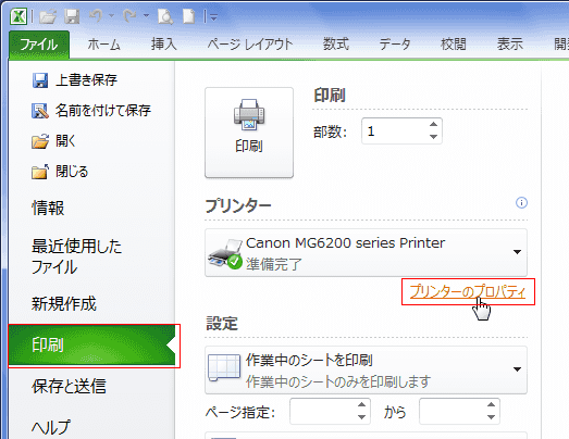 - [ファイル]タブの[印刷]を選択し[プリンターのプロパティ]を実行します。