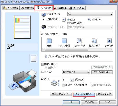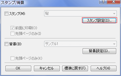 - [ページ設定]タブを選択し、下部にある「スタンプ/背景」ボタンをクリックします。