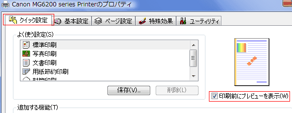 [クイック設定]タブで「印刷前にプレビューを表示」にチェックを入れます。