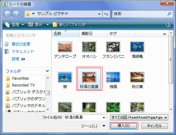 - 背景として表示する画像を選択して[挿入]ボタンをクリックします。