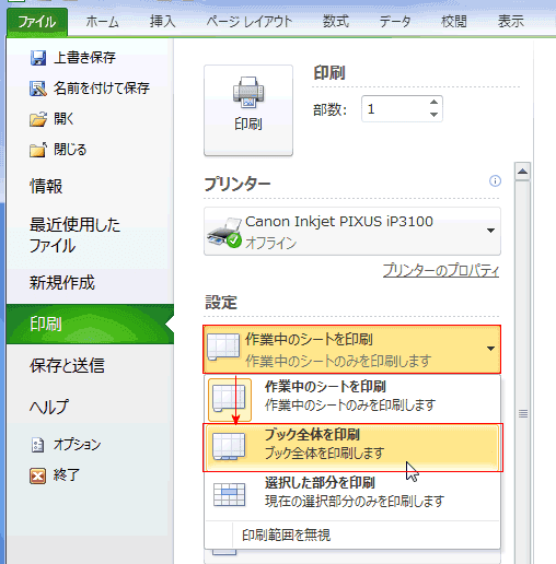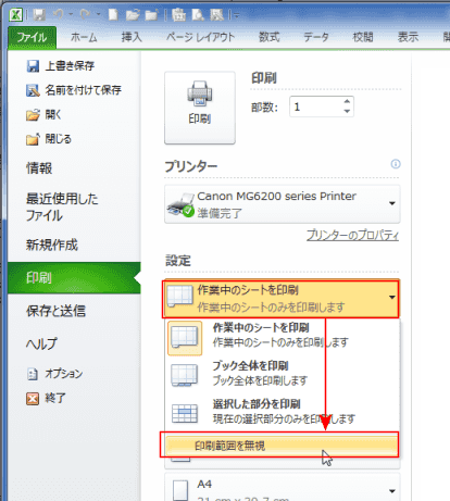 - [作業中のシートを印刷]をクリックし、「印刷範囲を無視]を印刷」を選択します。