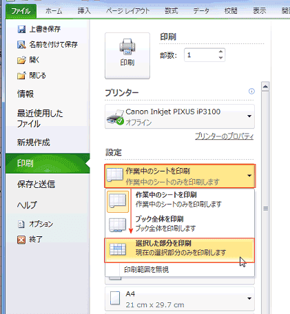 [作業中のシートを印刷]をクリックし、「選択した部分を印刷」を選択します。