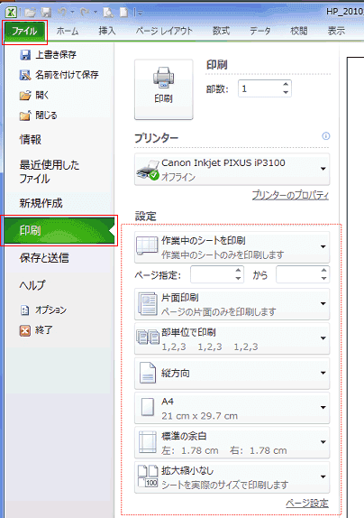 - Excel2010では印刷の設定ができる個所がいくつかあります。