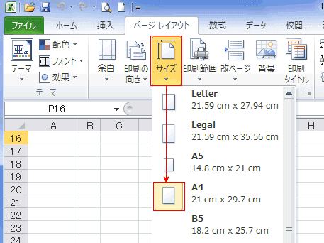 - [ページレイアウト]タブの[ページ設定]グループにある[サイズ]から用紙サイズを選択します。