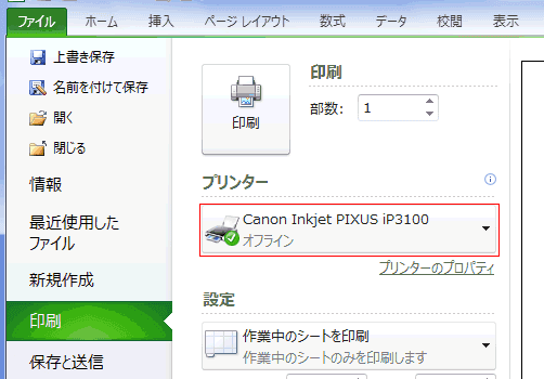 - 使用するプリンタは[ファイル]タブ→[印刷]→印刷のプリンタで設定されています。
