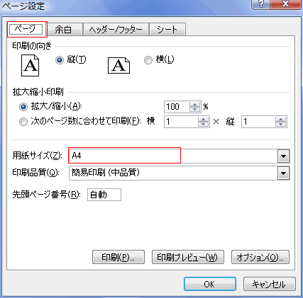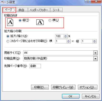 - [ページ設定]ダイアログボックスの[ページ]タブを選択して設定を行います。