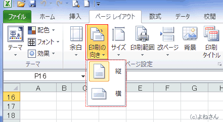 - [ページレイアウト]タブの[ページ設定]グループにある[印刷の向き]を実行します。
