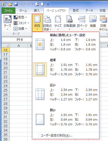 - [ページレイアウト]タブの[ページ設定]グループにある[余白]を実行します。