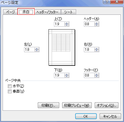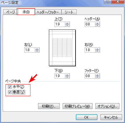 - [ページ設定]ダイアログの[余白]タブでページ中央の[水平][垂直]にチェックを入れることで用紙の中央に印刷ができます。