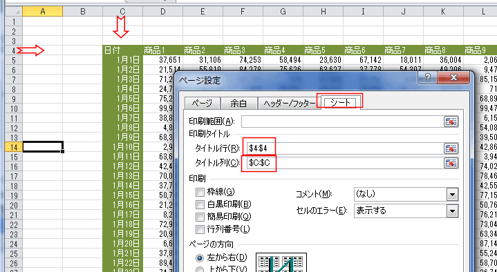 ここでは、表の横方向のタイトルと縦方向のタイトルを各ページに印刷するように設定する方法を紹介しています。