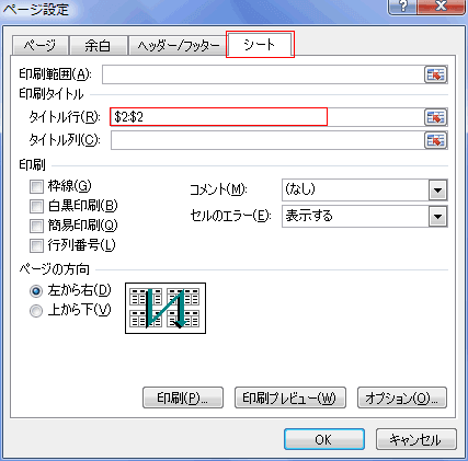 - [ページ設定]ダイアログの[シート]タブで「タイトル行」に各ページに印刷するタイトルの行を設定します。