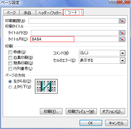 - [ページ設定]ダイアログの[シート]タブで「タイトル列」に各ページに印刷するタイトルの列を設定します。