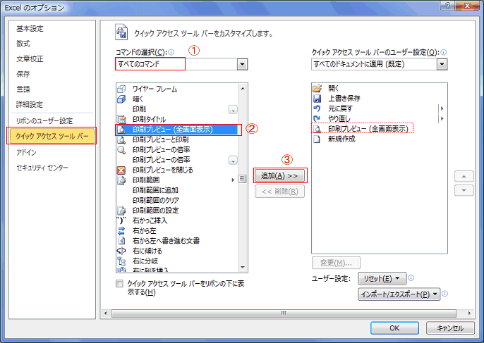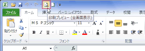 - クイックアクセスツールバーに[印刷プレビュー(全画面表示)]ボタンが登録できました。