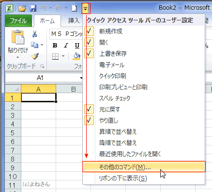 - クイックアクセスツールバーの[▼]ボタンをクリックし、[その他のコマンド]を実行します。