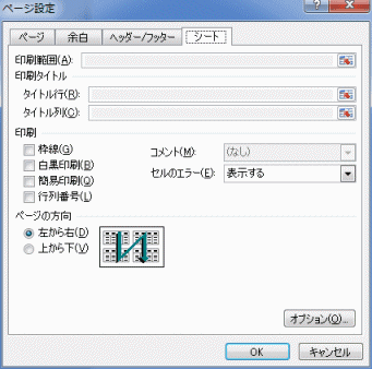 - 印刷プレビュー(全画面表示)のページ設定からはシートタブを開いた状態です。