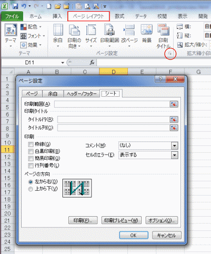 - 印刷プレビュー(全画面表示)のページ設定からはシートタブの一部が設定できませんのでご注意ください。