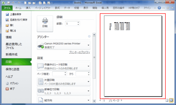 - 印刷範囲をA:Fと指定しているのですが、データがあるのは狭い領域なので、ページ数は1/1ページ となっています。