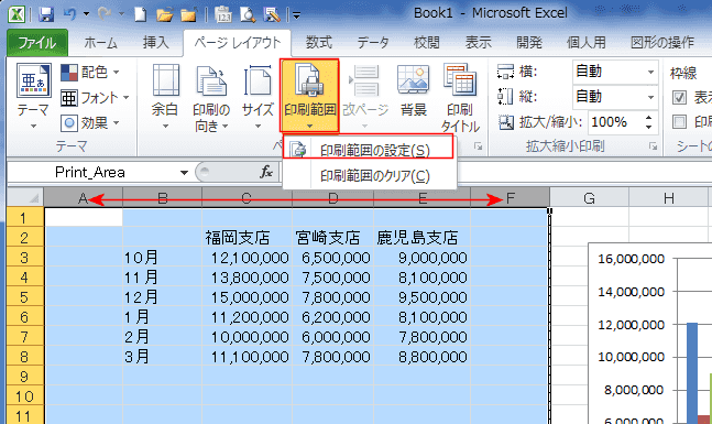 下図の例では A:F を印刷範囲として指定した例です。