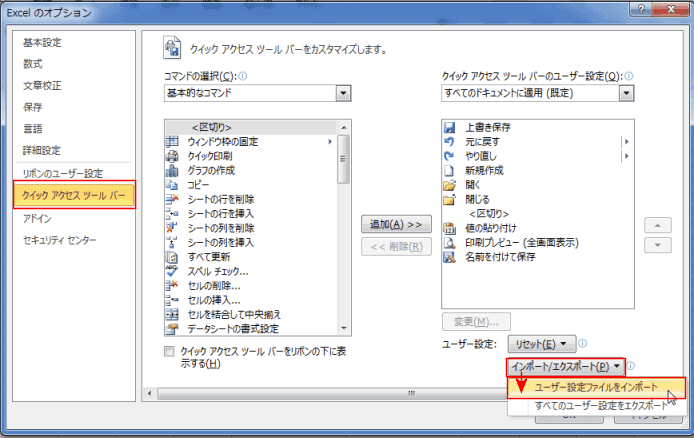よねさんのExcelとWordの使い方|エクセル2010基本講座:目次|リボンとクイックアクセスツールバー|クイックアクセスツールバーのエクスポート/インポート