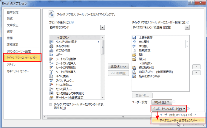 - [クイックアクセスツールバー]を選択し、[インポート/エクスポート]→[すべてのユーザー設定をエクスポート]を実行します。