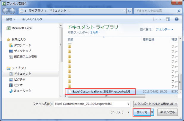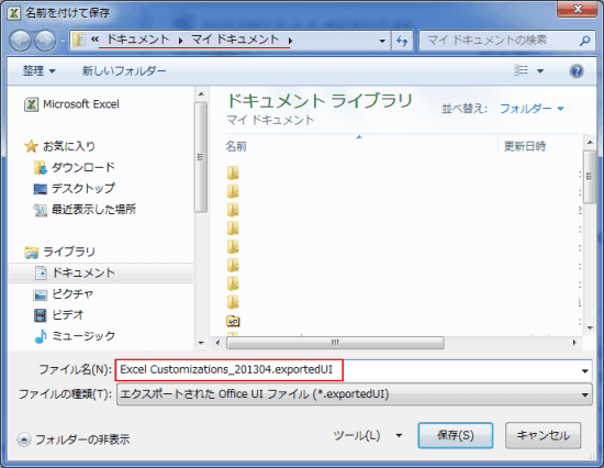ファイル名には「Excel Customizations.exportedUI」と入力されています。