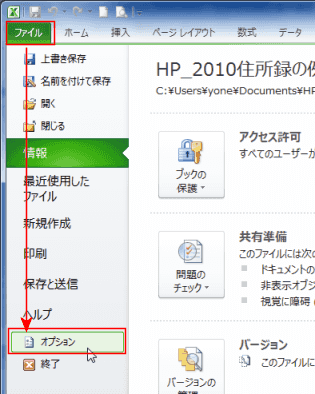 - [ファイル]タブの[オプション]を実行します。