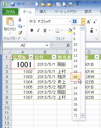 セルを選択して、フォントサイズ「20」にマウスポインタを合わせた状態です。